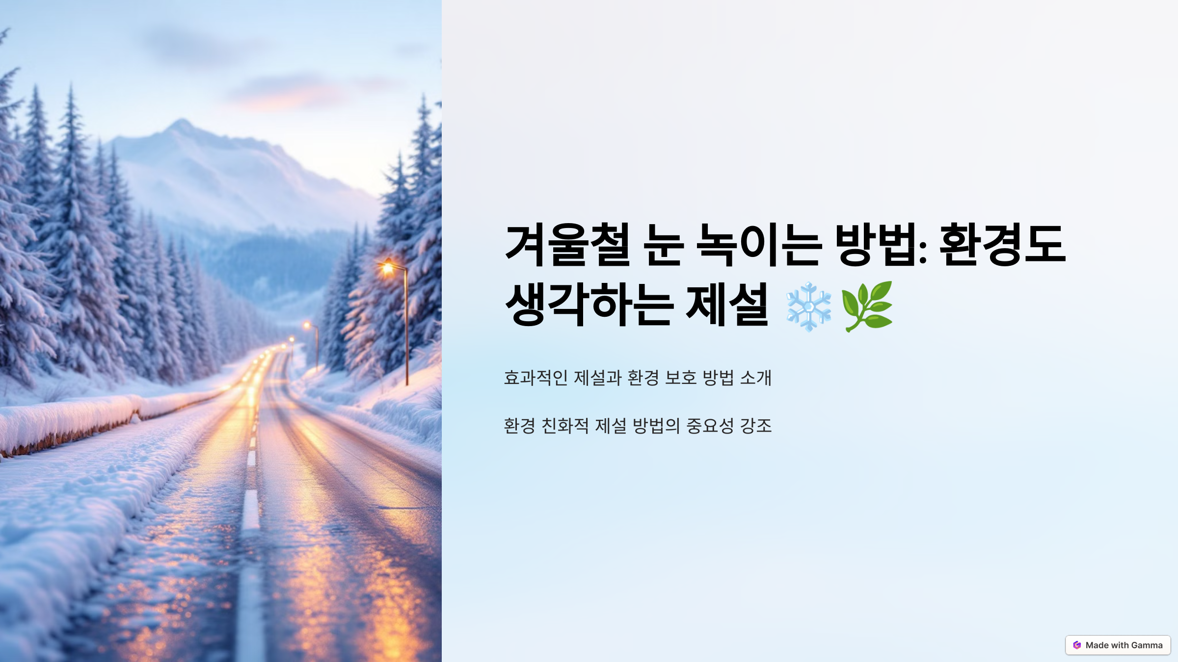 ✅ 친환경 제설제는 자연에서 분해되는 성분으로 만들어져 환경 영향을 최소화합니다.