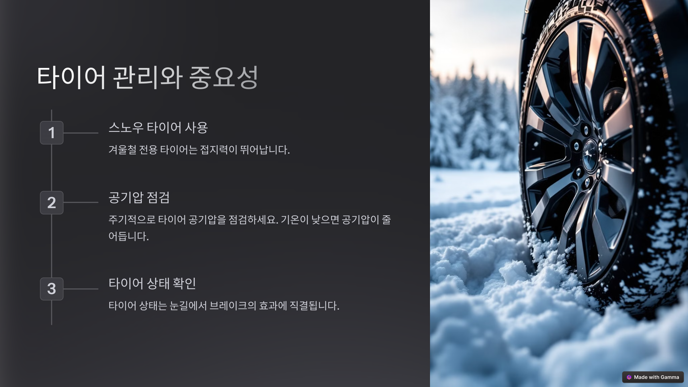 - 스노우 타이어를 사용하세요. 겨울철 전용 타이어는 접지력이 뛰어납니다.