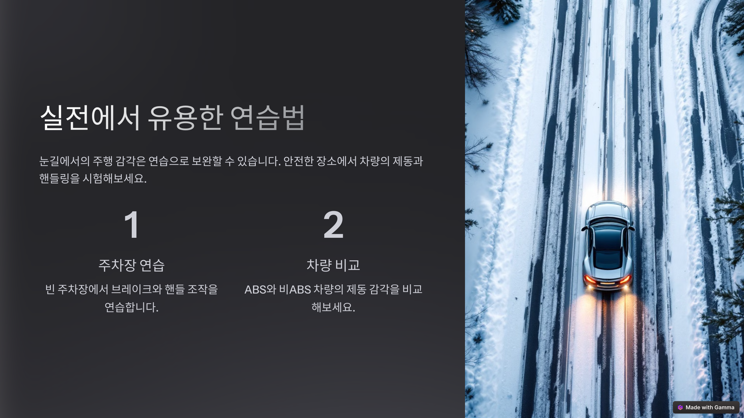 눈길에서는 브레이크뿐만 아니라 핸들 조작과 속도도 중요합니다. 특히 커브 구간에서는 브레이크 사용을 줄이고, 핸들을 천천히 조작하세요.