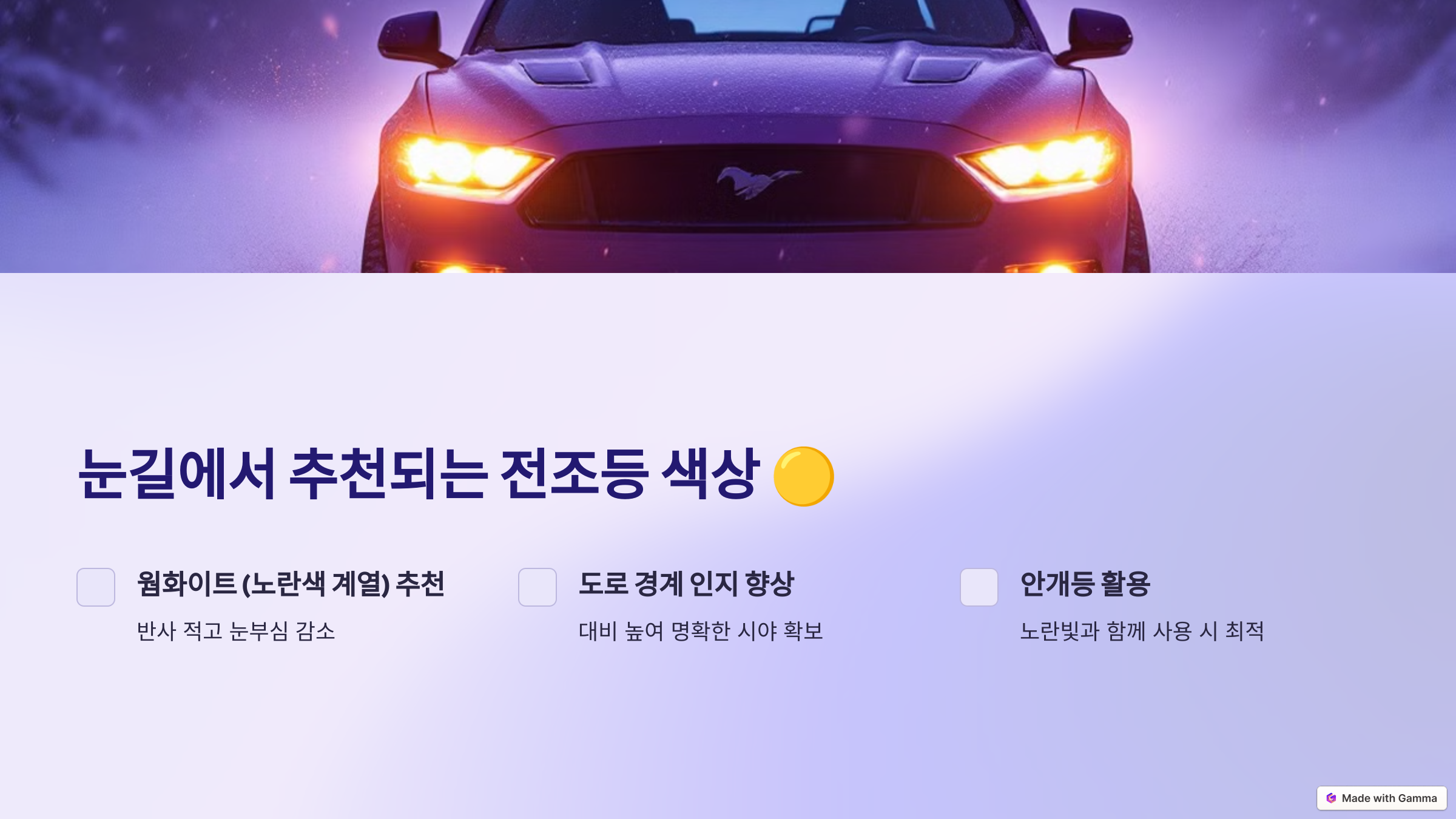 눈이 내리는 날에는 빛이 눈에 반사되어 시야가 더 어려워질 수 있습니다. 따라서, 웜화이트(노란색 계열)의 전조등을 추천합니다.