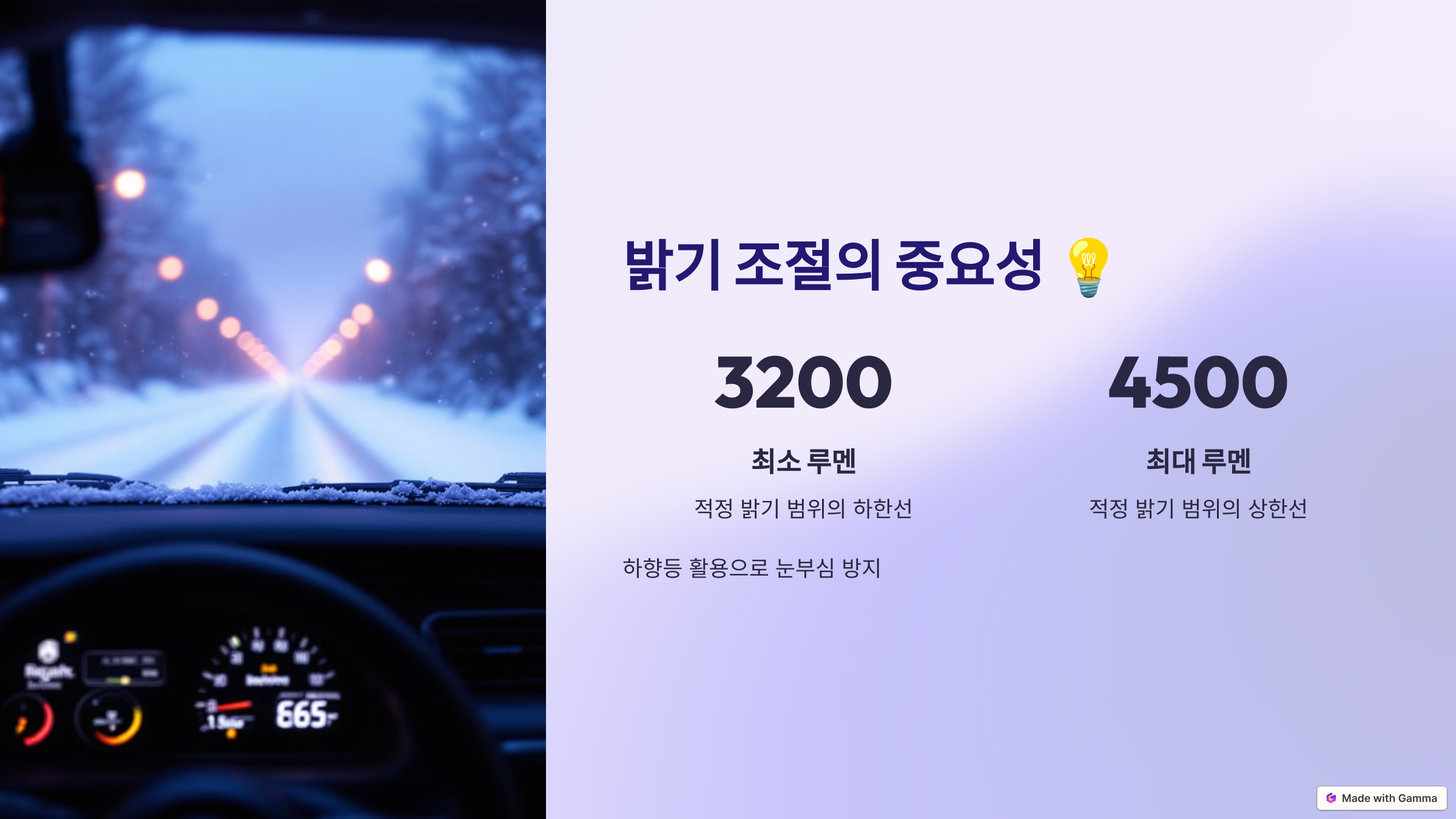 밝은 전조등은 멀리 볼 수 있게 해주지만, 눈길에서는 지나치게 밝으면 오히려 눈부심을 유발할 수 있습니다.