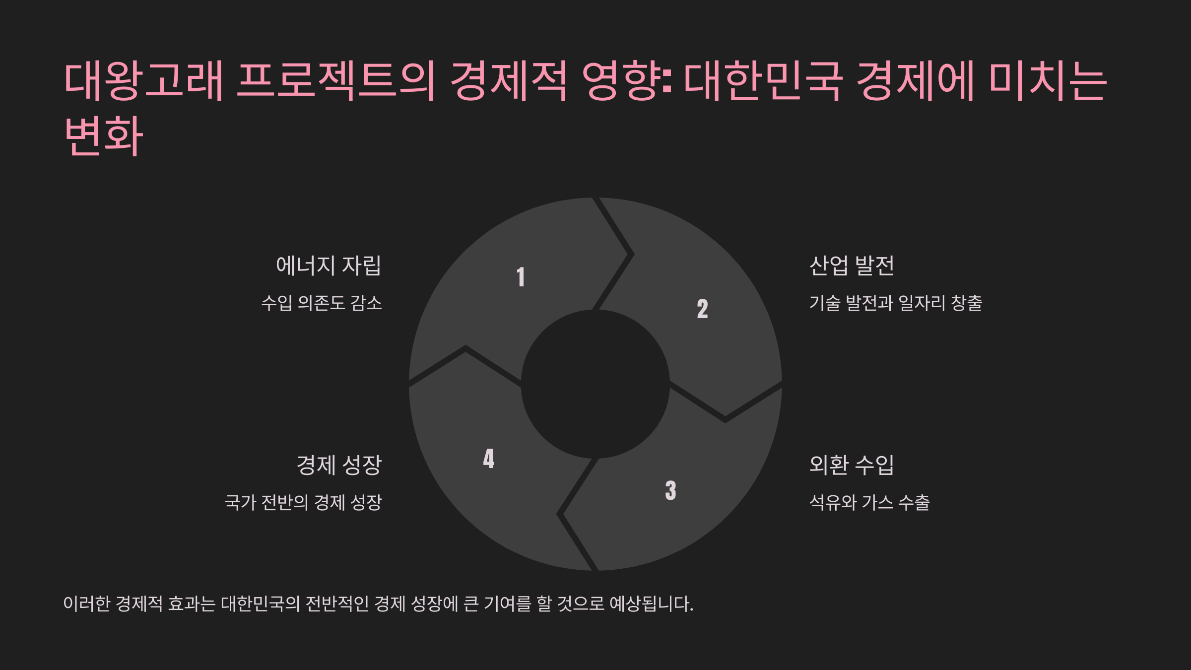 대왕고래 프로젝트가 성공적으로 진행된다면, 대한민국 경제에 큰 변화를 가져올 것입니다. 첫째, 자국에서 생산되는 석유와 가스는 수입에 의존하던 에너지 문제를 해결할 수 있는 큰 전환점이 될 것입니다. 둘째, 이 프로젝트를 통해 국내 에너지 산업의 기술 발전과 관련 분야의 일자리 창출이 예상됩니다. 셋째, 동해에서 채굴되는 석유와 가스는 해외로 수출할 수 있어 국가의 외환 수입도 증가할 가능성이 큽니다. 이러한 경제적 효과는 국가 전반의 경제 성장에 큰 기여를 할 것입니다.