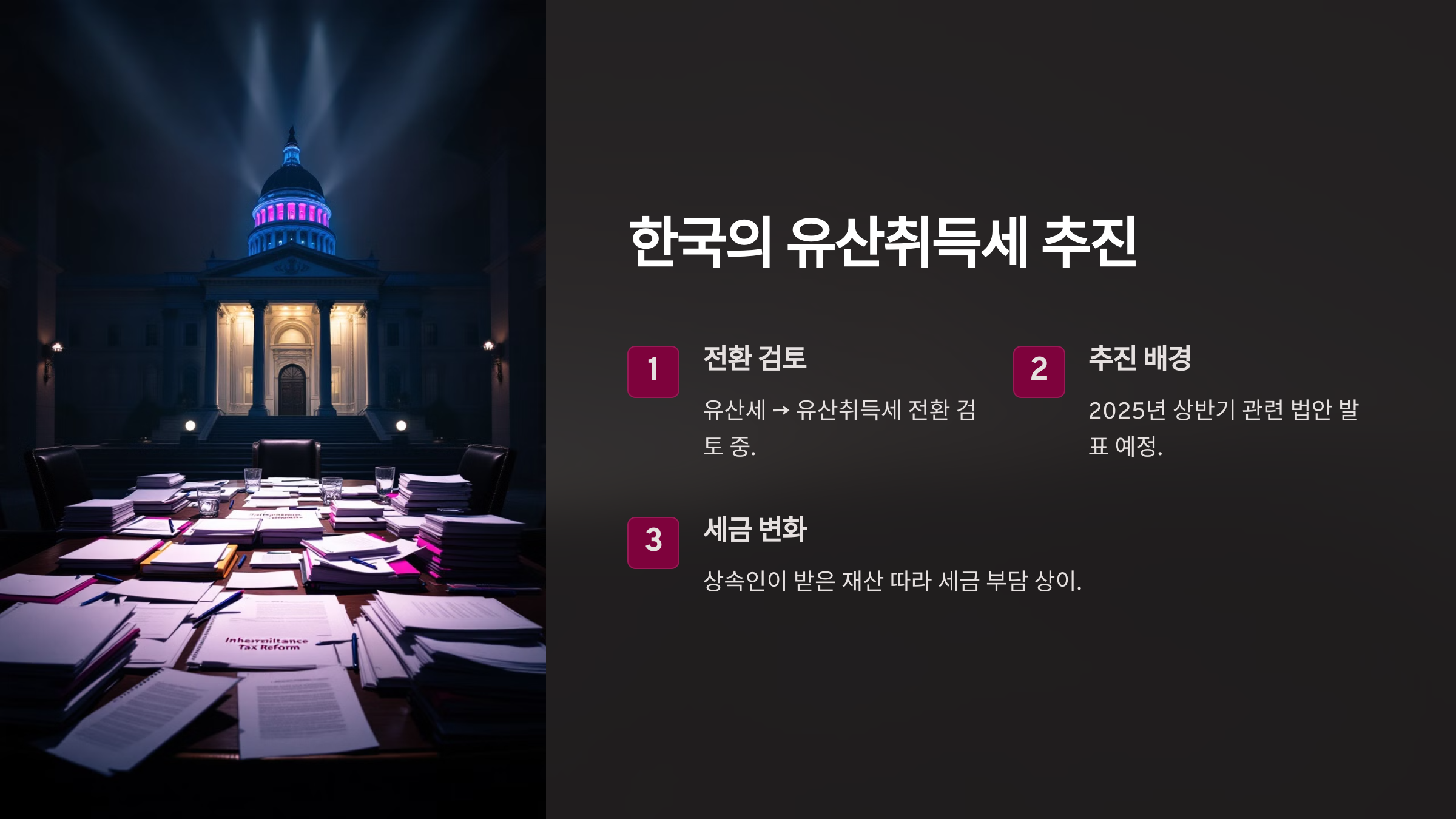 - 기획재정부는 2025년 상반기 중 유산취득세 도입 관련 법안을 발표할 예정입니다.