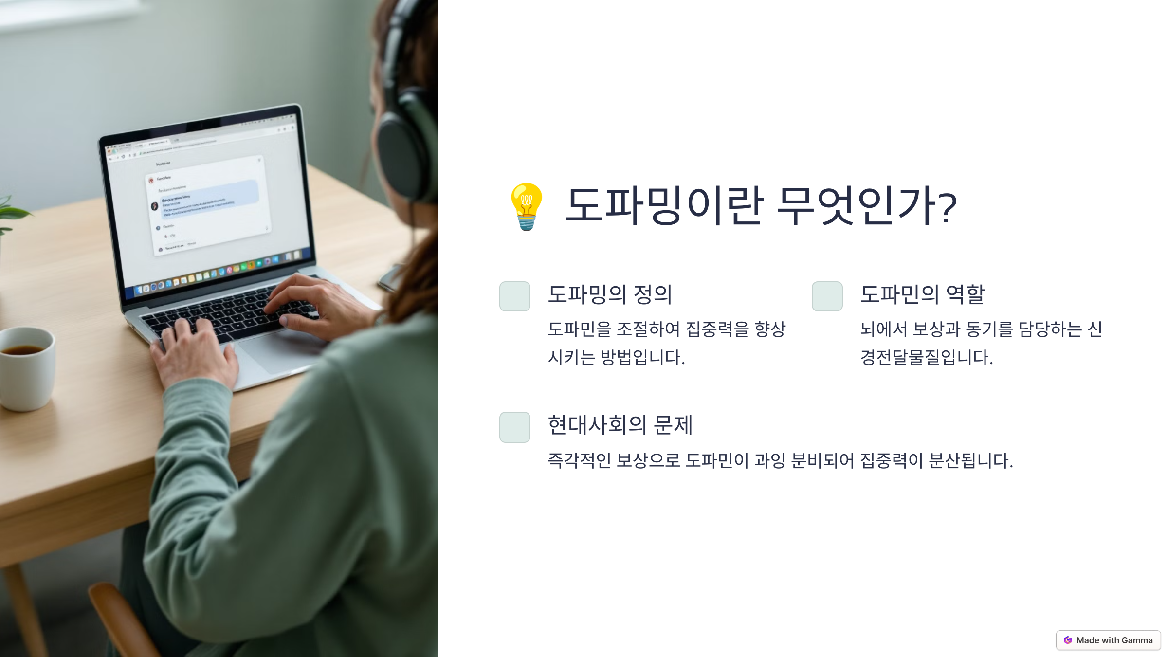 태그: 도파밍, 도파민, 집중력, 생산성, 몰입, 뇌과학, 공부법, 자기계발, 딥워크, 도파민디톡스