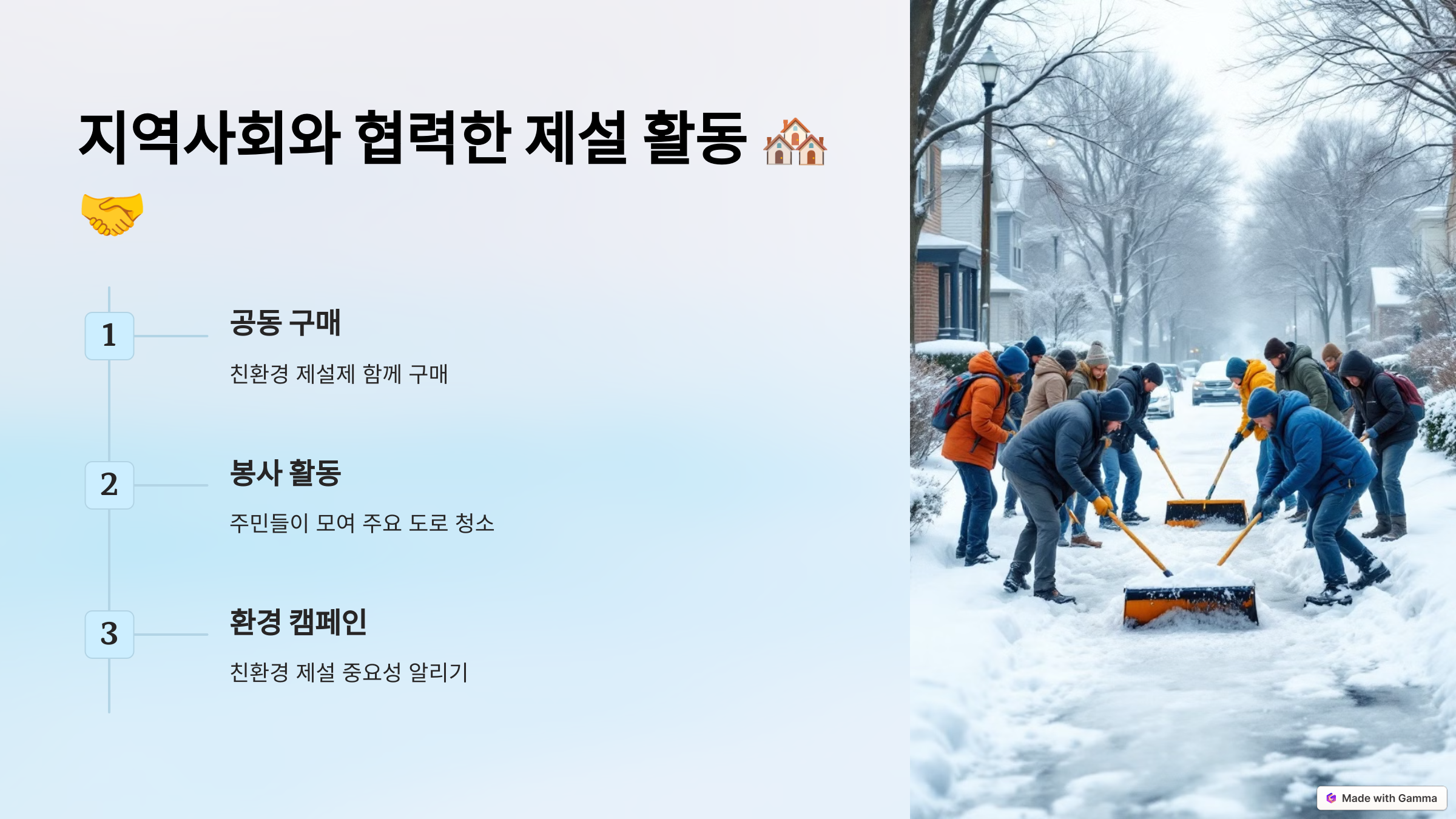 - 공동 제설 도구 구매: 친환경 제설제를 함께 구매해 비용을 나눌 수 있습니다.