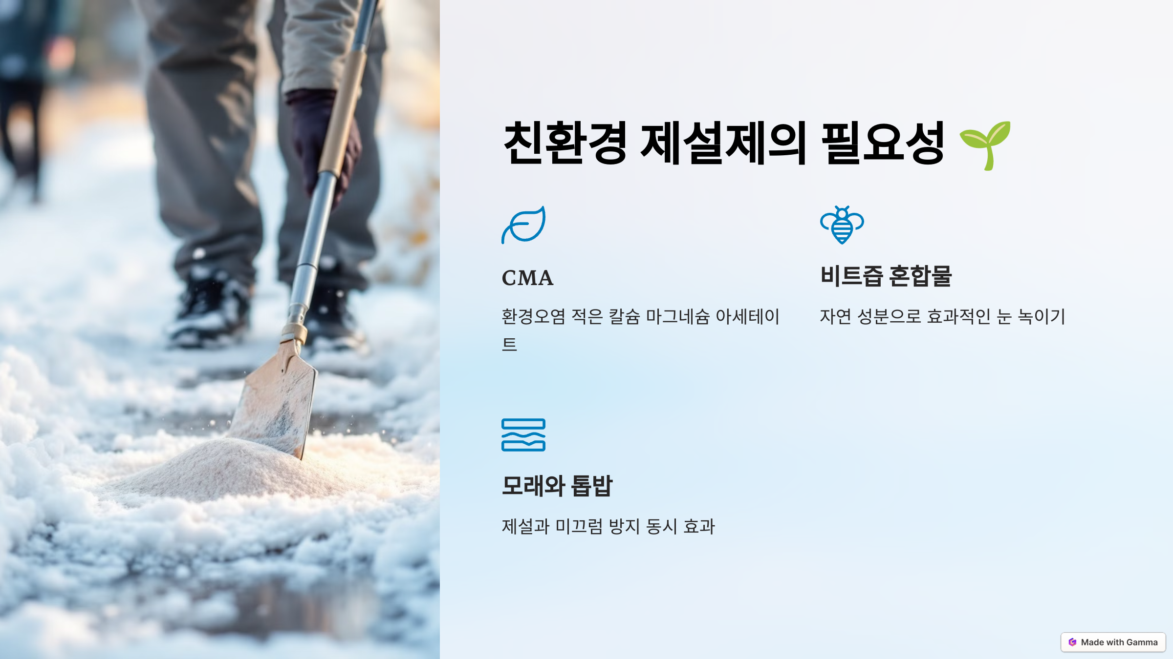 - 칼슘 마그네슘 아세테이트(CMA): 일반 제설제보다 환경오염이 적습니다.