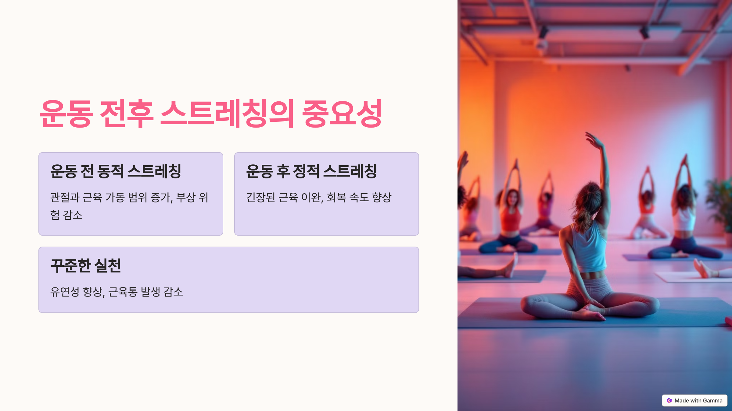 운동 루틴에 스트레칭을 포함해보세요. 꾸준한 스트레칭은 유연성을 높이고 근육통 발생을 효과적으로 줄여줍니다.