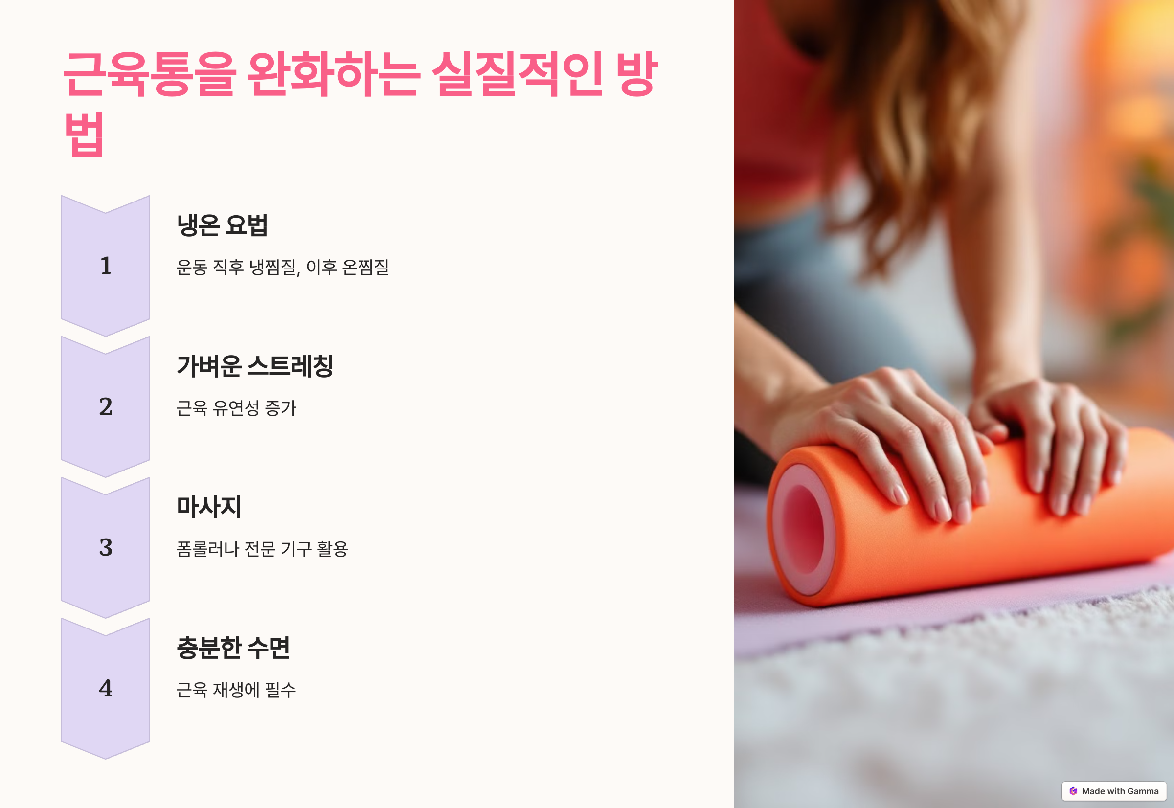 - 마사지: 폼롤러나 전문 마사지 기구로 근육 긴장을 완화하세요.