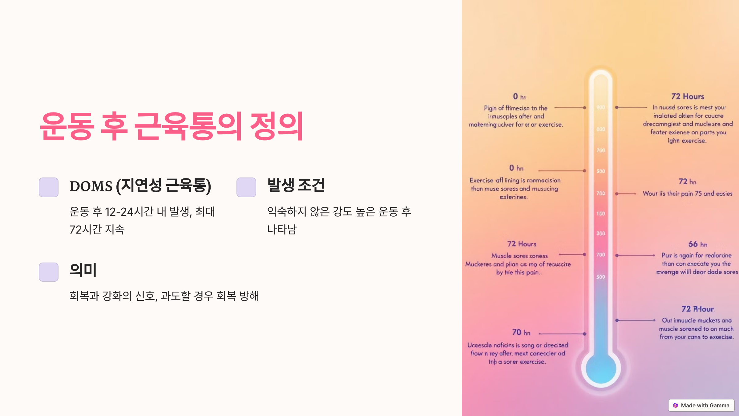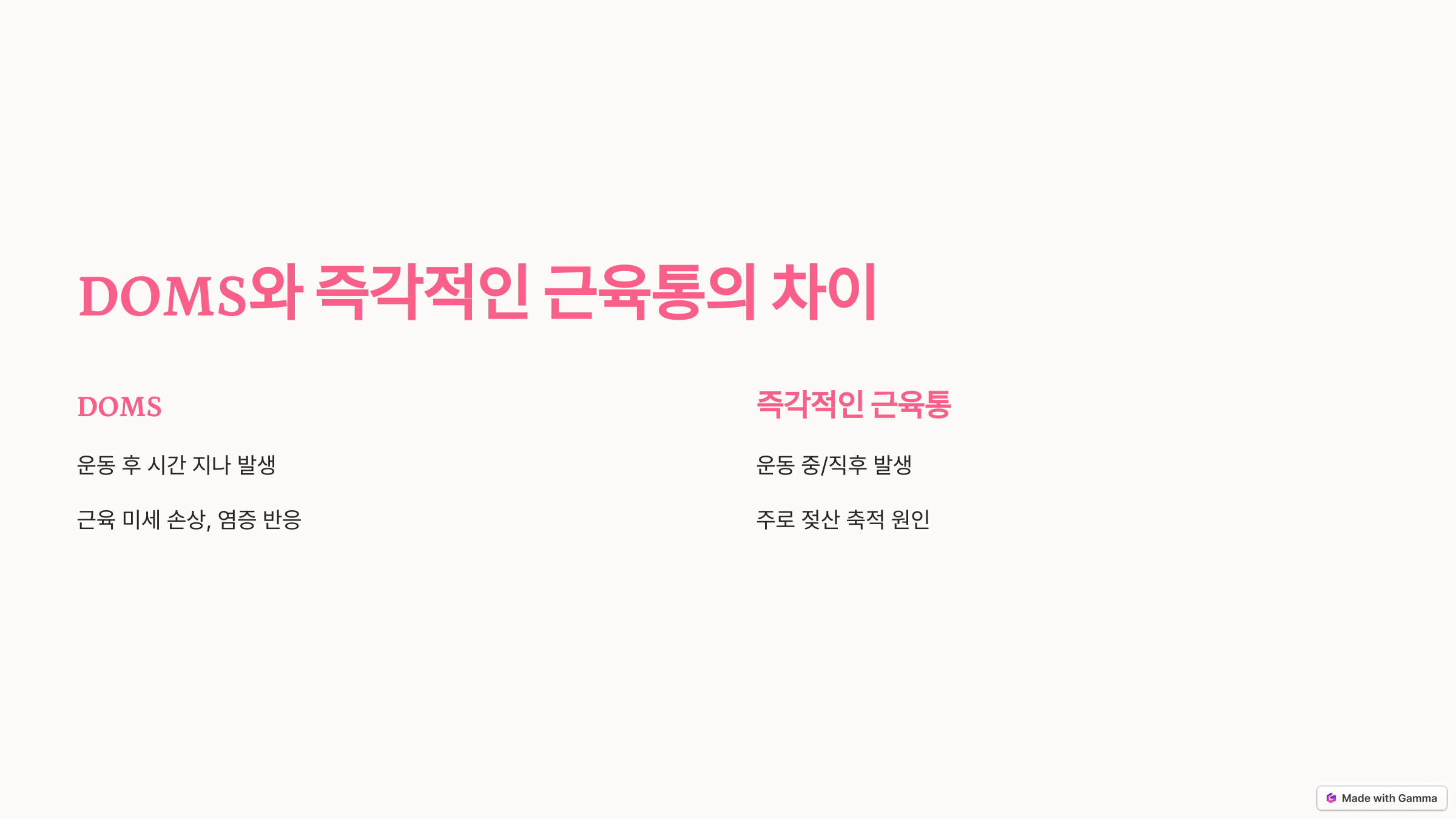 - DOMS: 새로운 자극으로 근육이 미세하게 손상되며 염증 반응과 회복 과정에서 느껴지는 통증