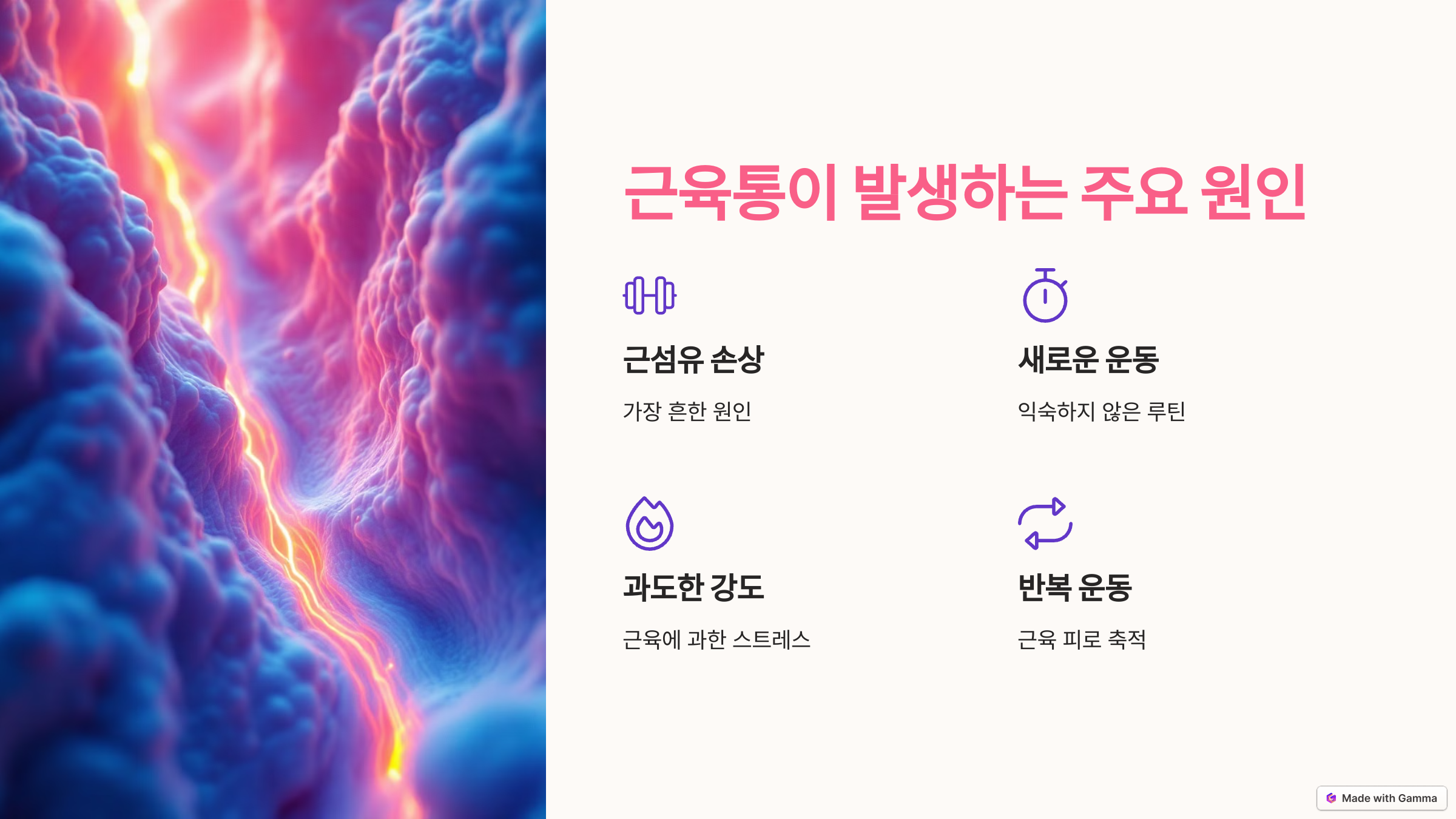 근육통은 우리 몸이 스스로 회복하고 강해지는 신호로 볼 수 있지만, 과도할 경우 오히려 회복을 방해할 수도 있어요.