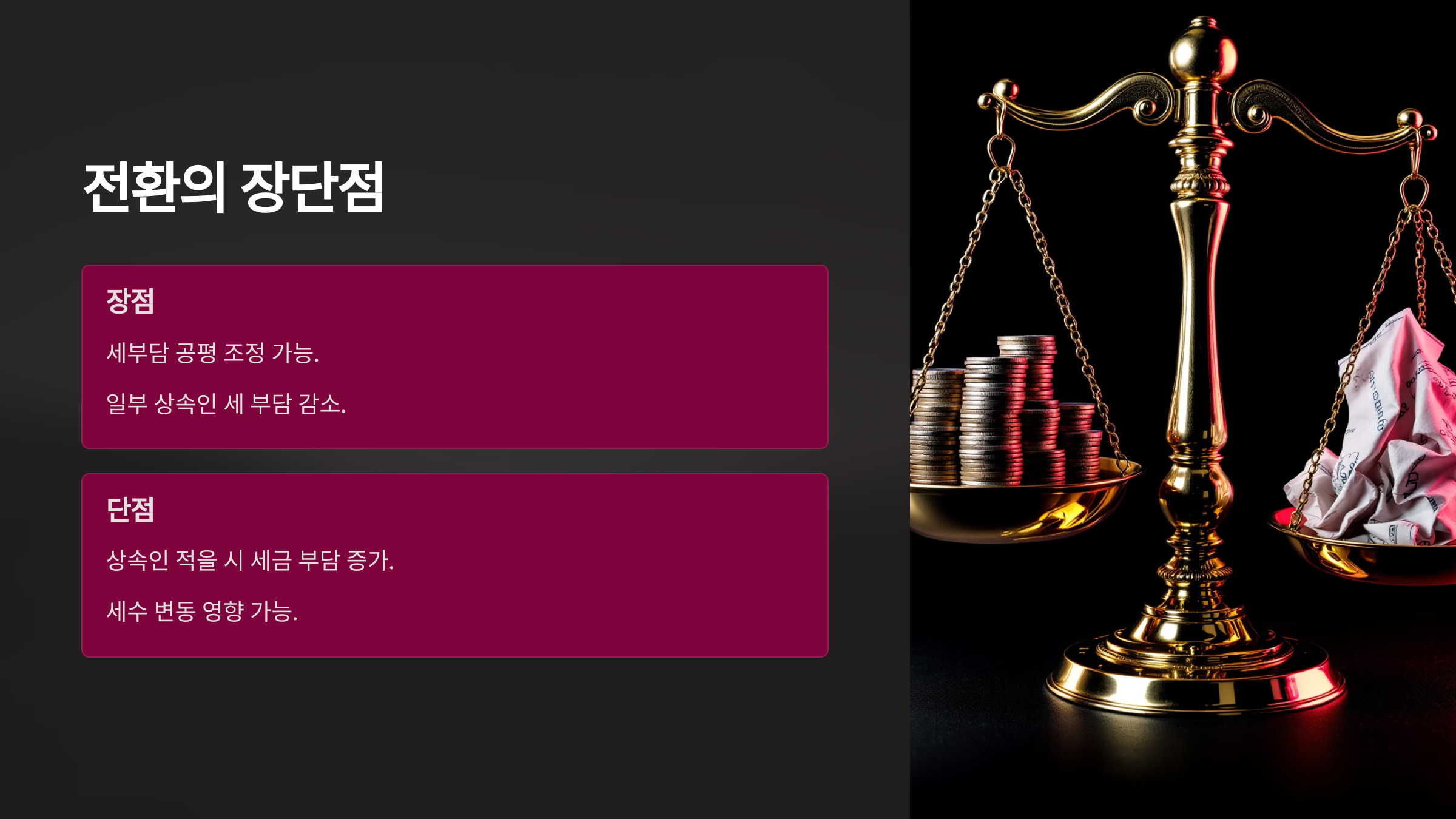 - 기존 유산세 방식보다 일부 상속인의 세 부담이 줄어들 가능성 있음.