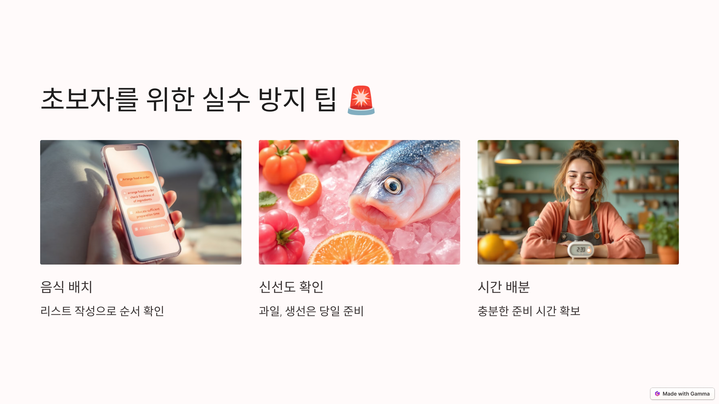 - 신선도 확인: 과일이나 생선은 상하기 쉬우니 당일 준비하세요.