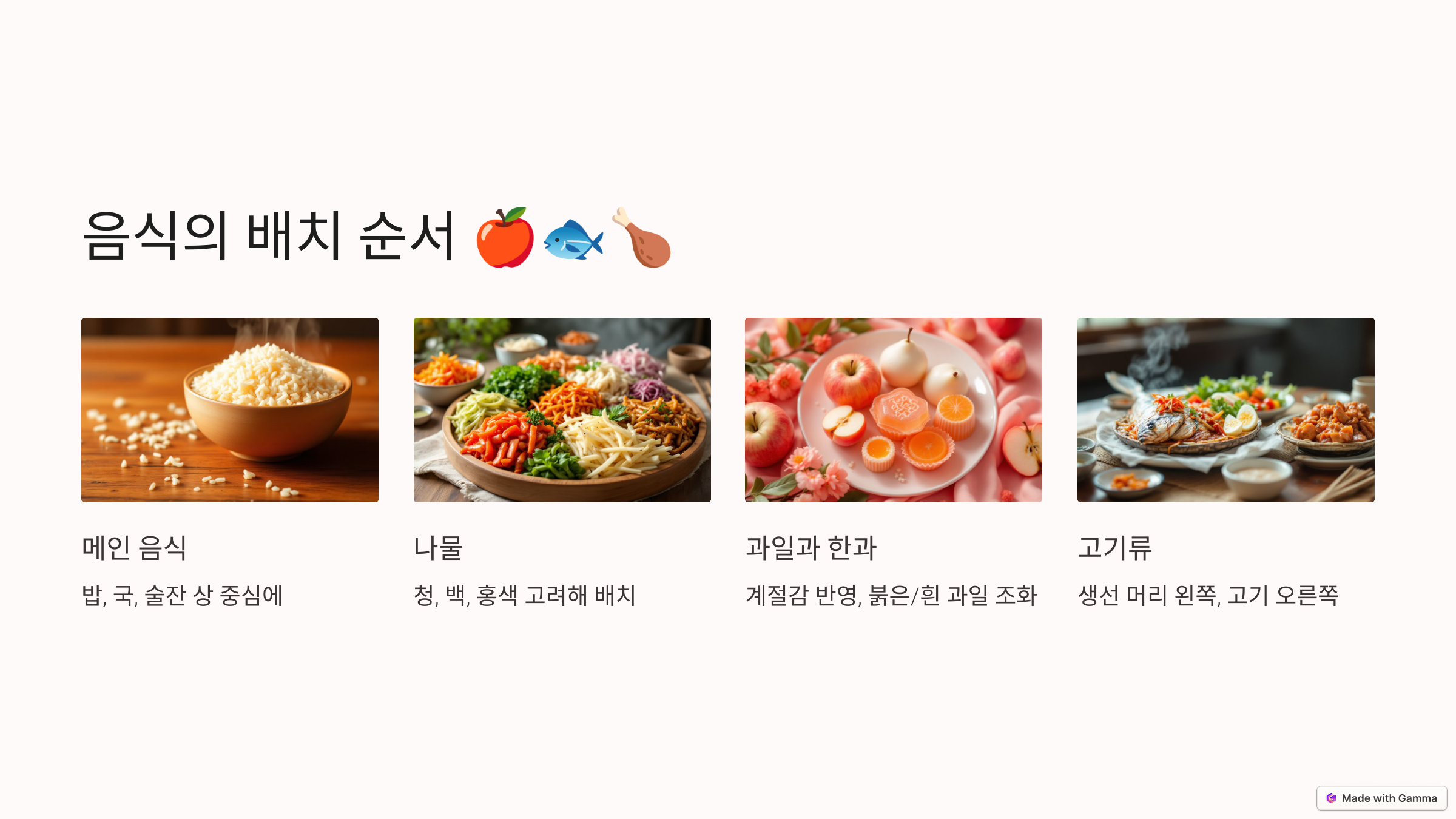 - 나물: 청, 백, 홍색을 고려해 배치하면 아름다움을 더할 수 있어요.