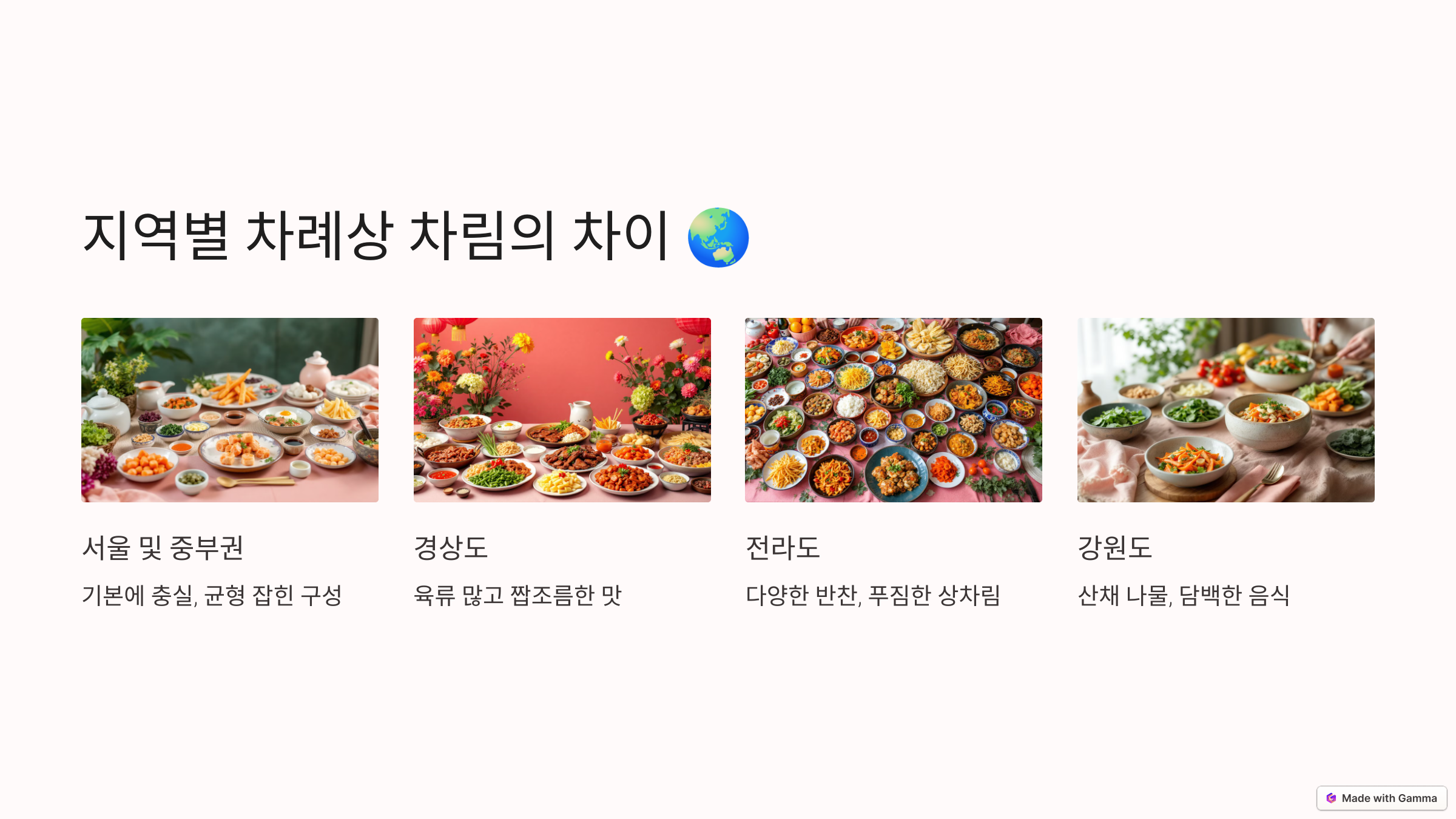 - 전라도: 다양한 반찬과 푸짐한 상차림이 특징입니다.