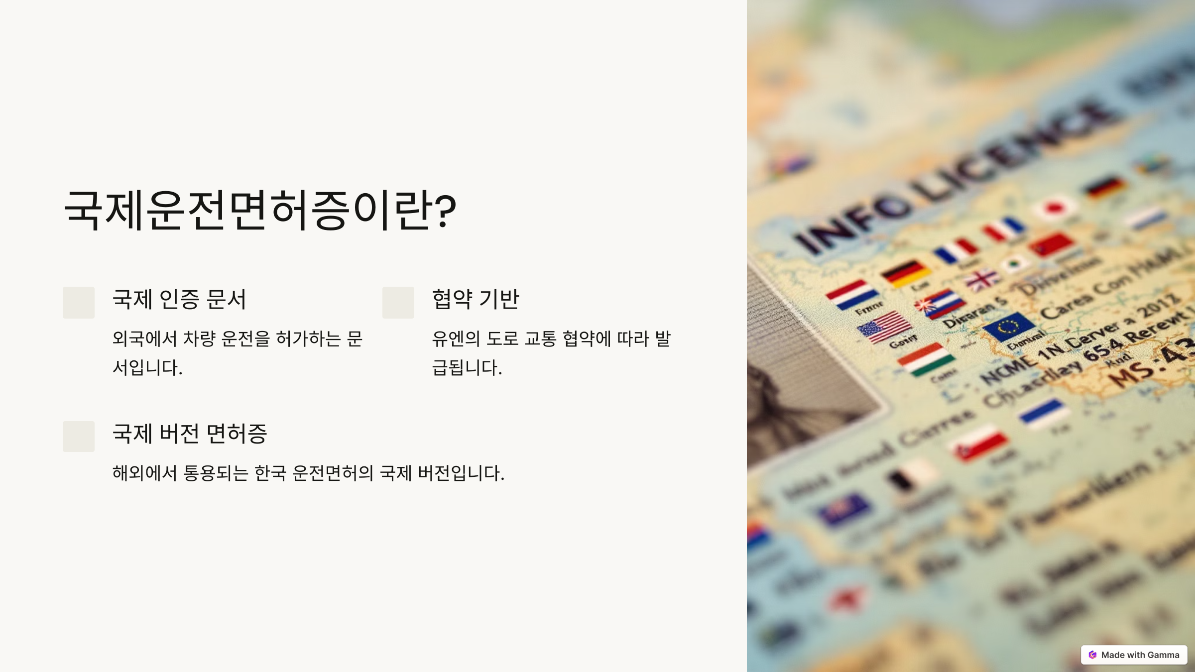 국제운전면허증은 외국에서도 차량을 운전할 수 있도록 인증해주는 문서입니다. 유엔의 도로 교통에 관한 제네바 협약과 비엔나 협약에 따라 발급된 이 면허증은, 협약에 가입한 국가에서 한국 운전면허를 증명하는 역할을 합니다.